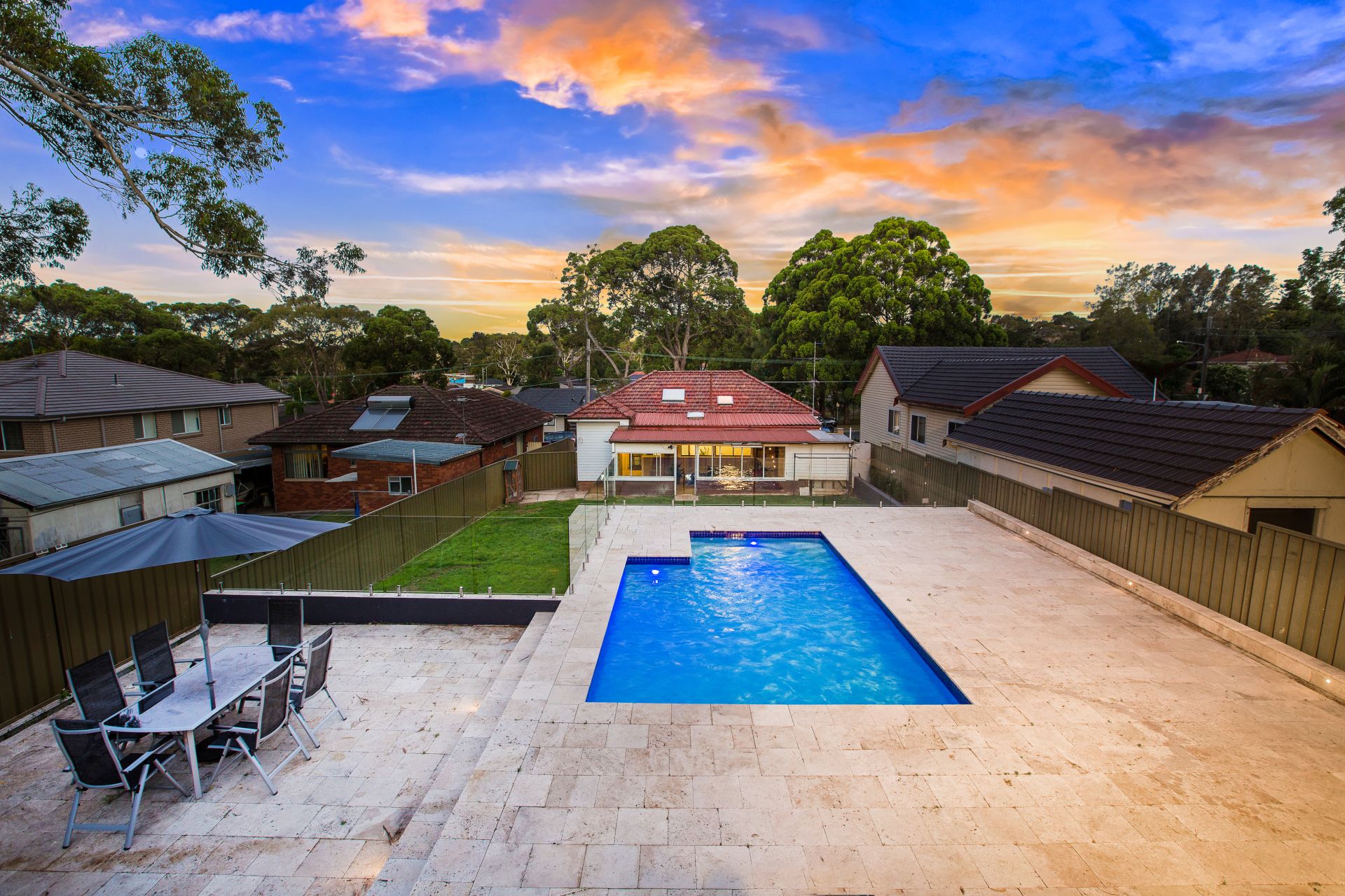 - Stylish pool with travertine tiles and separate entertaining area